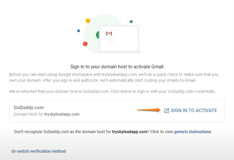 After the previous step, a new tab will open, where you’ll be able to Sign in to your domain host with a one-click sign-in to activate Gmail.