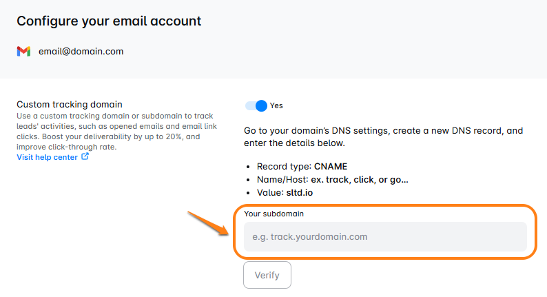 - Since we’re creating a subdomain, you need to use the prefix you’ve created (e.g., track, click, go, etc.) and paste it into Skylead under the Your subdomain field.